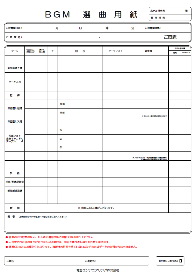 ご披露宴で使用するBGMを「BGM選曲用紙」にご記入ください。
